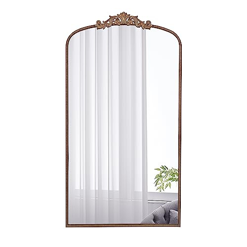 Boasting a grand arched silhouette, a smooth golden frame, and an intricately crafted regal adornment at the head, this full-length mirror blends classic baroque style with versatile function. Measuring a large 66H x 36W x 2D, it will capture your whole reflection with ease while also elevating the decor in your living room or bedroom.